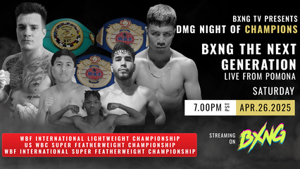 Tune in to BXNG for an action-packed night of boxing from DMG Promotions. This sensational card features top prospects, tough contenders and future stars.