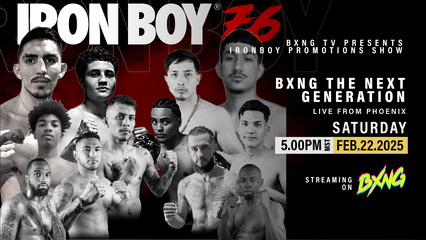 Tune in to BXNG for another thrilling night of boxing from Iron Boy. This exhilarating card features local prospects and future stars, all taking the next step on their journey to greatness.
