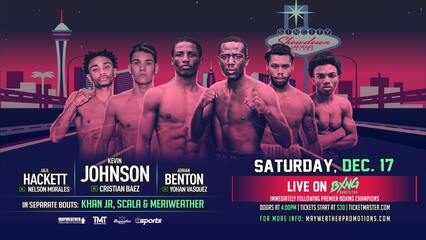 Mayweather Promotions presents SIN CITY SHOWDOWN live on BXNG TV, Saturday, December 17th from Las Vegas, NV. Tune-in for an action packed night of boxing featuring Kevin “Thunderstorm” Johnson (12-2, 8KOs) vs. Cristian Baez (18-2,17KOs), Adrian Benton (7-0,4KOs) vs. Yohan Vasquez (25-2,20KOs), Micky Scala (6-0,4KOs) vs. Ricardo Villalba (20-6-1,8KOs), PLUS! Jalil Hackett (4-0,3KOs), Dorian Khan Jr.(2-0,2KOs), and Robert Meriweather (2-0,1KO) in separate bouts.